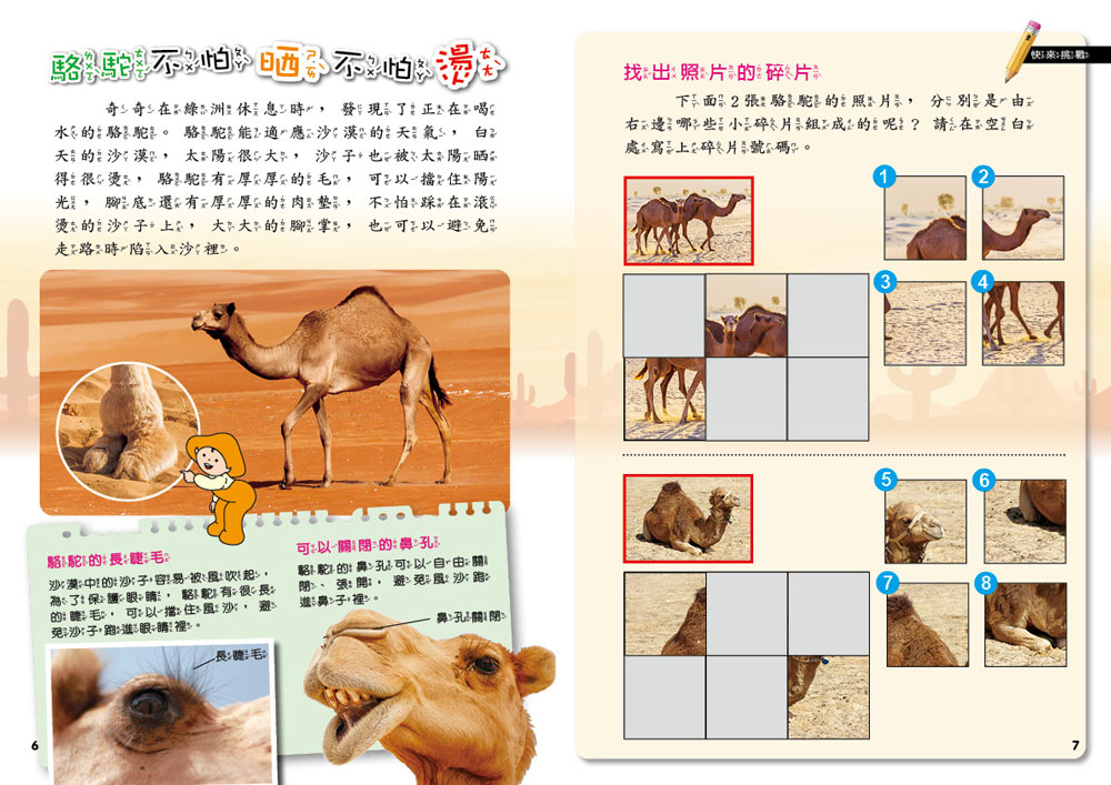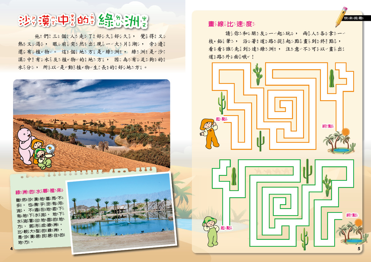 快來看看《PLAY & LEARN:沙漠冒險》,認識仙人掌、石花、百歲蘭、駱駝、狐獴等20種動植物,還可以玩連連看、找不同、迷宮、邏輯訓練等遊戲,在有趣的遊戲中,學習豐富科學知識!